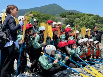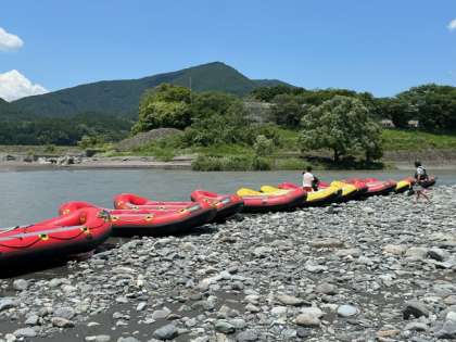 ラフティングのスタート地点に着きました。山梨県側から4キロのコースです。青空の中、最高のコンディションです。