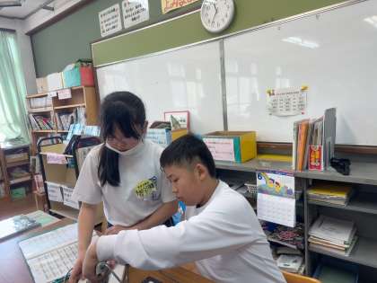 図書館での貸出・返却のお仕事や本の整備を行う体験をしました。中学校で普段見られない目の輝きがありました。 明親小学校です。