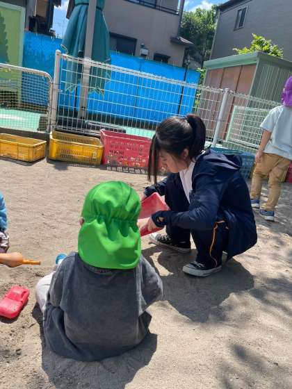 園庭で園児たちとにぎやかに遊んでいました。遊ぶために靴をはかないといけませんが,そこの補助のできていました。園長先生から,「保育園のころから知っているが,成長した姿を見ることが嬉しい!」とコメントいただきました。淀白鳥保育園です。