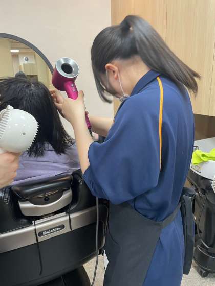 美容師さんとともに,生徒たちお互いの髪の毛で練習していました。NEZUさんです。