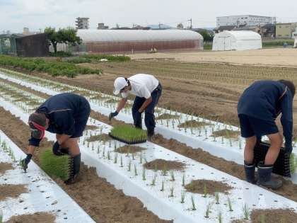 200m近くある畝に一生懸命ねぎ植えをしていました。気温も上がってきましたが黙々と体験する姿は農家さんそのものでした!農業体験です。