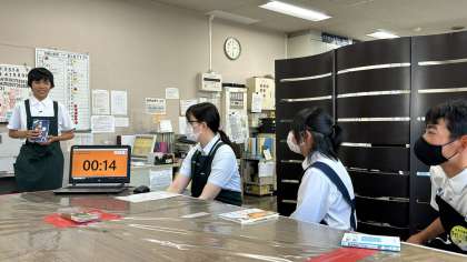 本の整備や管理の仕事を体験していました。14時からビブリオバトルをするということで学年教員がかけ付けました。体験している3名全員5分間でおすすめの本を紹介。2分間質疑応答を得て,Oさん紹介の「南総里見八犬伝」がチャンプ本に決まりました。どの本も読んでみたいと先生たちで話題になっていました。 伏見中央図書館さんです。