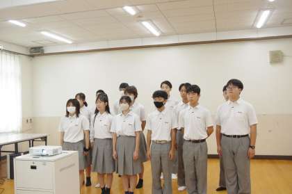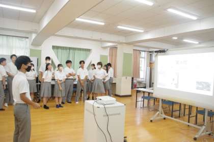 大淀では初めてではないでしょうか?オンラインでの学年集会です。2年生がチャレンジしています。放課後も毎日残って準備している姿を見かけていました。テーマは、いい学年そして大人になるために大切なことをみんなで考える。ということです。オンラインですが、全員参加型の夏休みについての○×クイズをしています。突然意見を求められる生徒もクラスから返答しています。双方向でのやり取りが出来ています。最後は、修学旅行に向けた劇をしています。校則の大切さや友達と一緒ならできることがあることをメッセージとして伝えています。準備した成果が発揮できた学年集会でした。