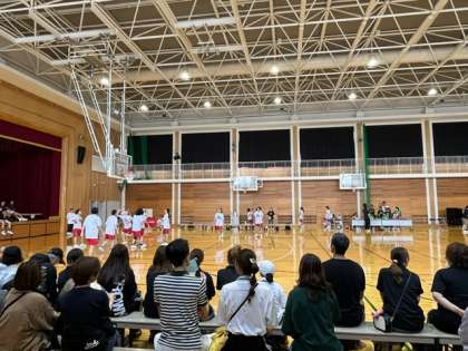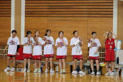 夏休みに入り各部活動の夏季大会が本格的に始まりました。女子バスケ部は、ベスト4に入り府大会に出場することが目標です。向島秀蓮小中学校を会場に、蜂ヶ岡中学校との初戦をむかえました。蜂ヶ岡中学校はノーシードながらもベスト8に入るくらいの実力です。春季大会では、1回戦・2回戦と100点ゲームを達成した女子バスケ部。初戦独特の緊張感の中、どんな戦いを見せてくれるでしょうか?会場には、多くの保護者や卒業生もかけつけ大応援団の前で試合が始まりました。