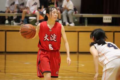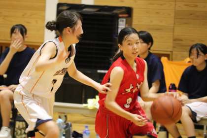 第3P終盤での連続ポイントで息を吹き返した大淀中。第4Pは、Kさん(3−5)のレイアップで大淀中が先に得点します。相手校の足が次第に止まってきたこともあり、終始、大淀中のペースで試合が進みます。残り2分15秒には、Kさんの遠い距離からのシュートが決まります。3Pかと思いましたが、ここは惜しくも2ポイント。しかし、最後に引き離した大淀中が44−26で、無事1回戦を突破しました。明日は2回戦。あと3回勝てばベスト4です。暑い中での試合が続きますので、十分に休息をとって明日の試合に備えて欲しいと思います。