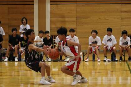 第4Pも、大淀中の得点でスタート。Yさん(3−2)を中心にしたパスゲームがさえわえわたります。開始1分には、Sさん(2−4)の鮮やかなフェイドアウェイが決まれば、負けじとYさん(3−2)も見事なフェイドアウェイを決めます。相手校のファウル数が重なったこともあり、フリースローの場面が増えます。2年生のとき、試合でなかなか決まっていなかったMさん(3−5)のフリースローでしたが、3年生になって大きく改善されて高い得点率です。終盤には、途中交代したMさん(3−3)が、コートに入ってすぐに得点を決めて72−39。前半の大接戦が嘘のように、一気に突き放した大淀中。終わってみれば、74−39の快勝でした。サイズのあるチームに勝てたことは大きな収穫です。さぁ、明日は京都精華学園での2回戦です。