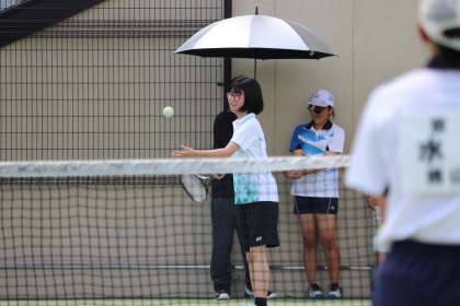 第1ペアには、Kさん(1−3)とNさん(1−5)のペアが出場しました。入部して3ヶ月ほどですからコートに立つだけでも素晴らしいことです。試合は完敗でしたが、2ポイントをとれたことだけでも健闘です。そして、サーブをすでに上から打つようになっていて感心しました。