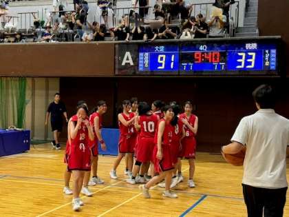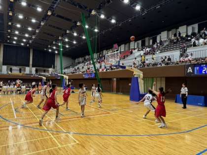 「今日の試合は、試合開始から大淀ペースです。前からのディフェンスでプレッシャーをかけ、相手を圧倒します。第2Pからリザーブメンバーが出場です。最初の得点はSさん(3−5)の3Pシュートでした。第3Pからは、5月からマネージャーとしてチームに貢献していたYさん(3−2)が出場し、見事得点を決めました。この試合のハイライトは、第4P残り5分を切ったところです。大淀ベンチはタイムアウトを取ります。まだ得点を決めていなかったAさん(3−2)が得点するためのセットを考えます。結果、その形はうまくつながらなかったものの、Aさんが見事得点を決めると、ベンチも応援団も一丸になって、この日一番の大盛り上がりでした。結果、3年生の全員得点で幕を閉じました。」