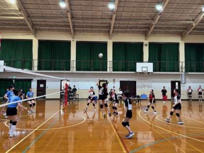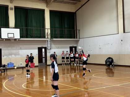 会場がアウェーな中、試合前の練習がスタートしました。全体的にサーブの調子が悪そうでしたが、持ち前の明るさ、元気のよさを出してゲームが始まりました。