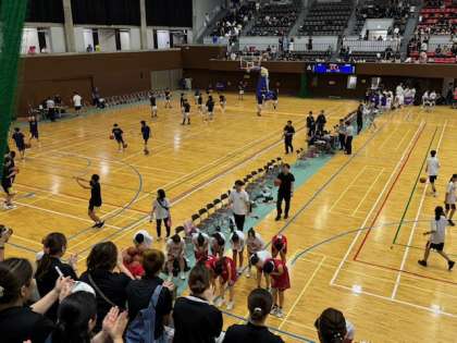 「”いつも通り!”試合開始前、キャプテンのKさん(3−5)を中心にメンバーで明るく声をかけ合い緊張感をほぐしています。そのおかげか、試合開始から大淀中のガッツあるディフェンスで試合を完全に大淀ペースで進め、第1Pを4−14で終えました。しかし、第1Pの最後から徐々に相手校のプレスを感じ始めます。むかえた第2P、その不安は的中しプレスに引いてしまうようになります。相手校に次々と得点を決められ前半を18−28とリードされてしまいます。後半も、第1Pとまったく逆のパターンで相手校に試合を進められます。劣勢に立たされながらも、ベンチメンバー、観客にいる1・2年生も最後まで声を枯らして応援し続けます。それでも、流れを呼び込むことはできず、あえなく敗戦となりました。