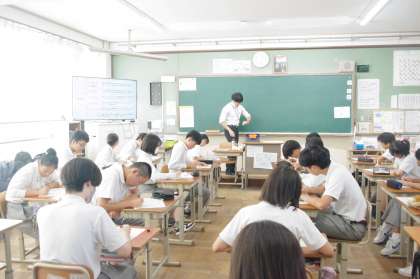 先生がいつもと違う。そうなんです。3年生の授業は、高校の先生方による体験授業です。洛水高校と京都翔英高校から先生方にお越しいただき国語・理科・社会の授業をしていただいています。生徒の皆さんにとっては短い時間でしたが高校の授業を体験するいい機会となりました。高校の先生方にしっかり挨拶している姿もベリーグッドでした。