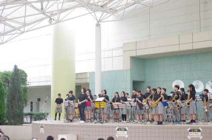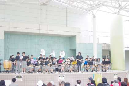 淀体育カーニバルの会場は、淀競馬場です。ここで体育カーニバルが出来るのは淀地域ならではです。吹奏楽部も粋な計らいで競馬のG1ファンファーレでスタートします。会場には老若男女たくさんの方々が参加しています。まずは、アニメソングで子どもたちの心をつかみます。2曲目は、ドラえもんが登場です。大勢の前でドラえもんやり切りました。この曲は、みんなに愛されている曲です。最後の曲は、めざまし8の曲で会場全体の手拍子で会場が一体感に包まれます。体育カーニバルの前に大淀中学校吹奏楽部が立派な華を添えてくれました。