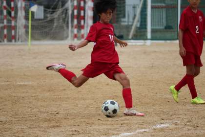 後半開始、Hさん(1−5)がコートに入ります。同じ1年生のOさん(1−4)の前線からのプレスが効果的で、前半よりも攻め込むシーンが増えました。54分、ロングパスに反応したS.Sさん(2−3)さんが抜け出すも、相手DFにブロックされシュートに持ち込めません。必死に守りを固めながら、カウンターを狙う大淀中。59分、ついに得点シーンが!カウンターで抜け出したS.Mさん(2−3)が一閃。ゴール左隅にゴールを決めます。64分には、Kさん(2−4)も抜け出しますが、シュートは惜しくもゴール右に外れます。後半終盤から盛り返しただけに、前半から同様のプレーができればと思いました。
