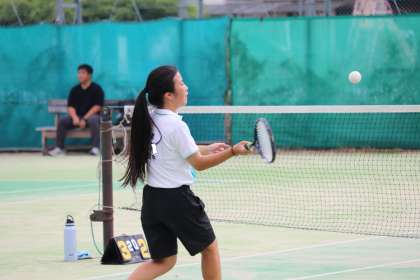 女子ソフトテニス部の1年生は、2年生の出場がありませんので、夏の大会にも3年生相手に試合を行っていました。この試合には、Tさん(1−3)・Kさん(1−3)ペアが出場しました。夏の大会のときよりも、サーブがしっかりしてきてポイントを重ねていきました。また、2人ともサーブのあとのリターンが良かったので、3ゲームとも優勢に試合を進めました。
