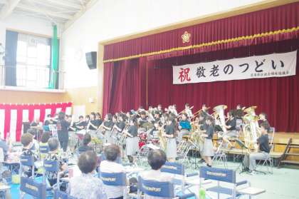 9月29日(日)美豆小学校にて敬老のつどいが開催されました。昼食休憩後に大淀中学校吹奏楽部が演奏します。会場には、たくさんの方々が来られています。吹奏楽部員の見事な司会に会場から笑いも聞こえてきます。ポップなノリのいい曲からピンクレディーメドレーへ。そして最後は、演歌メドレーに部員の1年生が一生懸命歌っています。会場の参観者は、自然と手拍子と首を縦に振って昔を思い出しているような仕草が見られます。アンコールには中島みゆきさんの“糸”を演奏します。吹奏楽部の見事な選曲と演奏に皆さん大満足でした。