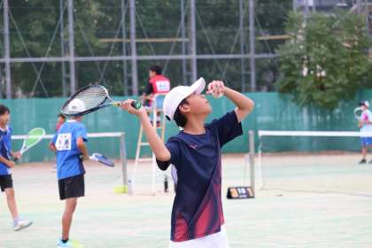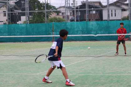 Kさん(1−4)とMさん(1−5)のペアの1回戦は、相手のダブルフォルトに助けられ幸先よく1ゲームを先取。ゲームを先取して機嫌よくゲームをしています。切れのあるカットサーブでサービスエースもとることも出来ました。見事なストレート勝ちです。2回戦は大淀中同士の対戦に勝利。準々決勝の対戦相手は、初級の部で1番実力が高いペアとの対戦となりました。このペアは、初戦でも大淀中ペアを破っています。試合は、力の違いを見せつけられてゲームポイント0−3の完敗でした。しかし、Kさん(1−4)のリターンエースなど、随所で好プレーが見られました。練習を重ねていけば、さらに強くなるなと思えた試合でした。