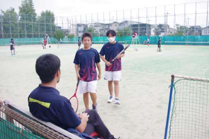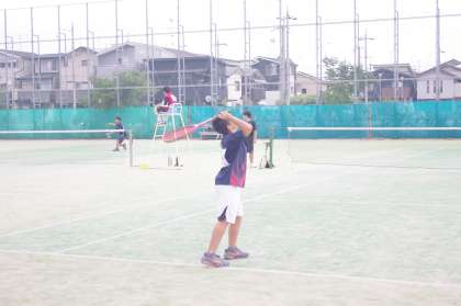 1−4 Kさんと1−4 Yさんペアは、いきなり連続ファーストサービスでポイントを奪います。しかし、相手は、強いショットはないもののしっかりリターンをします。第1ゲームを落とすも第2ゲームを取り返す。第3ゲームはデュースの連続で落とし、流れが悪くなったがここから挽回でファイナルまできます。接戦の最後はサービスエースで見事勝利です。2回戦の相手は、同じく1回戦を勝ち抜いた大淀中学校ペアです。始まる前からやりにくさを感じていたようですが、試合が始まれば両チームベストを尽くしています。どちらも引かないナイスゲームでした。