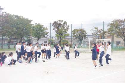 赤団の応援練習です。スタートは、ちょっと恥ずかしさがあります。それでも、赤団の応援団は、あきらめません。必死に大きな声で団全員を引張っています。そこで3年生が登場です。1年生2年生に3年生が手本を見せます。それに1年生が続きます。そして2年生も負けられません。今回の体育祭のテーマの縦割り活動を実行しています。まだまだ進化していきそうな感じです。