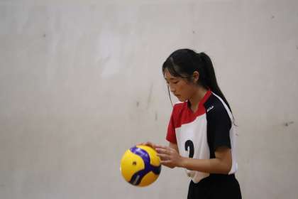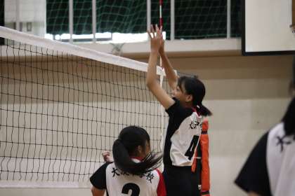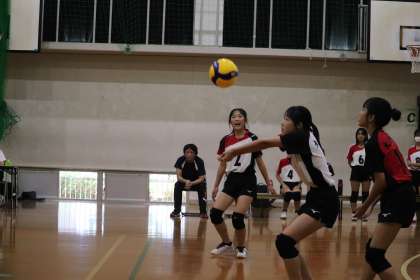 新チームは、ミスが少なく、Hさん(2−2)のサーブなどで着実に得点を重ね、Fさん(2−4)を中心に確実なレシーブでプレーしていました。相手校のミスが重なり9−7と大淀中がリードしたところで、相手校がタイムアウトをとります。ここから、流れが相手校に移り12−14と逆転されます。次は大淀中がタイムアウトをとり、16−17と1点差まで詰め寄ります。すると、相手校が2回目のタイムアウト。第1セットは、流れがどっちに転ぶかわからない展開となりました。
