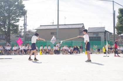 部活動対抗リレー(バラエティー部門)です。文化部が中心に工夫をしてリレーをしています。スタートの合図は、科学部です。最後は、家庭科部がたくさん野菜を持ってゴールです。