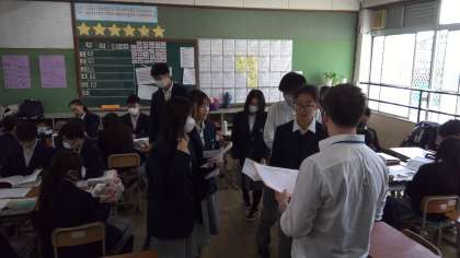 2年生の英語の授業は、ALTとのインタビュー活動です。その理由は、明日の校外学習です。2年生は、明日大阪へ校外学習に出かける予定です。班別で行動します。その中のミッションの一つに外国の方に英語でインタビューしようというミッションがあります。みんな一生懸命練習をしています。しかし、練習したことだけでは通用しません。いかに即興で会話が出来るかが大切です。もちろん英語力も大切ですが、伝えようとする気持ちと勇気も大切です。しっかりトライしてみてくださいね!You can do it!