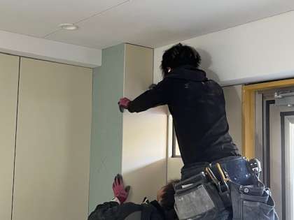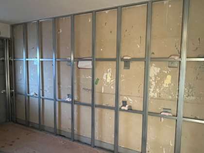 体育教官室、シャワー室、更衣室、トイレなど、体育館に付属されている各部屋の工事も進んでいます。金属で周囲に外枠を作り、そこに板を貼っていきます。板は二重構造になっています。職人さんは、板の寸法を測りピッタリになるように電動のこぎりでカットしていきます。その際、巨大な定規を使って垂直になるようにしています。なかなか見られない巧みの技でした。