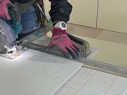 (真ん中の写真)板をカットする様子