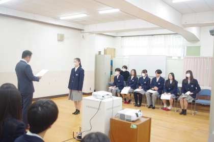 12月24日(火)全校としては、今日が最終日です。2年生・1年5組・1組は明日も頑張りますが・・・朝から終業式です。まずは、2学期を通しての伝達表彰です。社会科と国語科は人数が多くて代表生徒になりましたが、多くの方が全校生徒の前で表彰を行いました。引き続いての終業式では、校長先生恒例の年末年始の過ごし方や生徒指導部長と体育科教員のコラボした絵本の読み聞かせなどが続きました。最後は、生徒会本部の皆さんが“メリークリスマス”ということで各クラスに走り廻ってプレゼントを渡してくれていました。今日も少し寒いですが、この後、大掃除とドローンによる全校写真撮影になります。