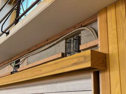 体育館の中は、ほぼ完成に近づき、現在、カーテンや空調機の取り付け作業が行われています。カーテンも新品になりました。取り付け部分は、大工さんが寸法を測り手作りで作成していました。職人の技には、ただただ感心します。