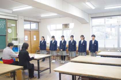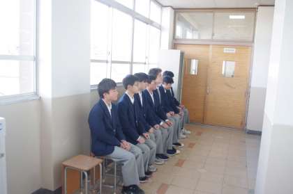 1年生が来年度のチャレンジ体験に向けて自分が行きたい事業所の面接試験を受けています。競争率は、事業所によって違いますが、みんな第1希望に行けるための面接準備をしています。面接会場は緊張感に包まれています。作法から受け応えまで練習の成果が出ているようです。この経験が、2年後の高校入試での面接や将来へ向けての作法の一つに繋がります。