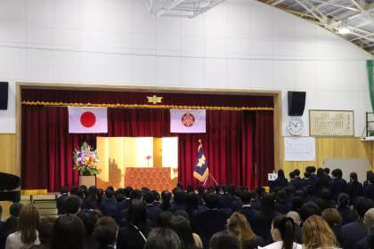 4月9日。快晴。校門前の桜が新入生を迎えてくれます。真新しい、ちょっと大きめの大淀中学校の制服がとてもフレッシュでよく似合っています。保護者の方々も朝早くから体育館前で開場を待っています。さぁいよいよ入学式が始まります。