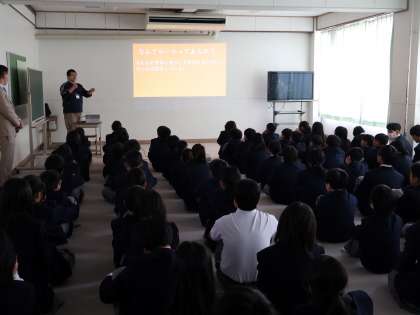 1年生が全員集合しています。初めての学年集会です。昨日の入学式の疲れも見せず、しっかり顔を上げてみんなよく話を聞けています。担当の先生から、ルールってなぜあるのか?中学校生活で大切にすることなどを全体で確認しています。一歩一歩、中学校生活に慣れていってくださいね。
