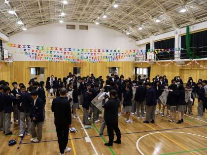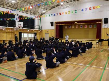 2時間目、2年生が体育館に集合して学年集会をしています。担当の先生方が自己紹介をしています。終始温かい雰囲気で話を聞いてくれています。さすが先輩です。先生方の自己紹介の後は、評議委員が中心となってレクを考えてくれています。みんな待ちに待ったという感じで大盛り上がりです。2年生、いい雰囲気で最初の学年集会をしています!