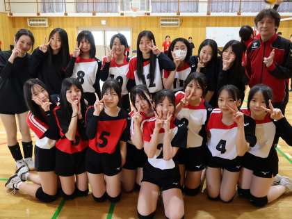 切り替えて第2セットに挑みます。しかし、相手の鋭いサーブとスパイクが決まっていきます。チーム大淀も必死にレシーブし、いくつもナイスプレーが出ましたが、1セット目の流れを取り戻すことが出来ず、2セット目も落としてしまいバレーボール部の春の大会が幕を閉じてしまいました。いつも明るいバレーボール部は、試合後もニッコリ笑顔で記念写真です。3年生にとっては、次が残り1回の公式戦になります。次は、勝利の笑顔を期待しています。