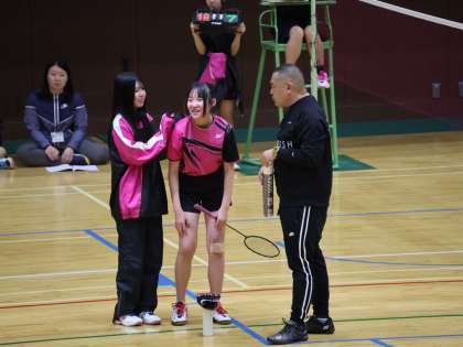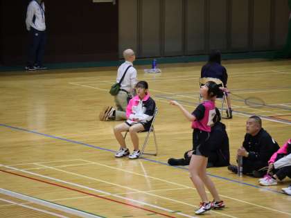 予選を調子よく突破した3年生のHさんは、シングルス唯一の出場です。大淀中学校を代表して頑張ってほしいです。相手は嵯峨中学校です。1セット目の出だしは順調で5点差のリードで試合は進みます。しかし相手がリズムに乗り始め徐々に追いつかれる展開になり16-21で落としてしまいます。作戦タイムに同級生の3年生Mさんからの激励をもらい2ゲーム目へ。このゲームは調子がいいです。最後まで油断せず21-14で取り返しファイナルへ入ります。ほぼ互角の試合です。いいラリーも続きます。しかし、最後は16-21で負けてしまいました。非常にいい試合でした。最後の夏の大会に向けて、3年生中心に頑張ってください