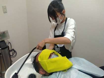 美容室では、訪ねてきてくれた先生の頭をシャンプーさせてもらいました!さっぱりした〜と喜んでおられましたよ。本日定休日の学校組も頑張ってくれました。花壇の水やりをした後、校門前にじょうろで「チャレンジ」書きました!