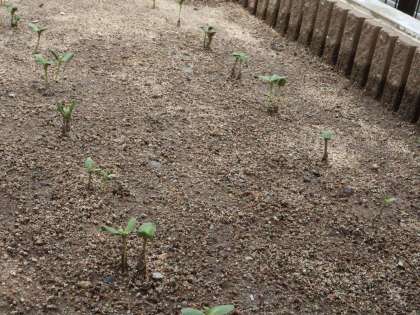 近畿地方も梅雨入りしすっきりしない日が続いていますが、今日は少し太陽が顔をのぞかせてくれています。1組が中心となって育ててくれている大淀菜園も水分をたっぷり含んで芽を出し花を咲かせてくれています。毎朝、成長する様子を1組の生徒が観察している様子も見かけます。大淀菜園で収穫されたものはどのように活用されるか楽しみです。また、その菜園の隣にも芽を出し始めた植物もあります。これは、何の植物なんでしょうね?大きく成長するのが楽しみです。