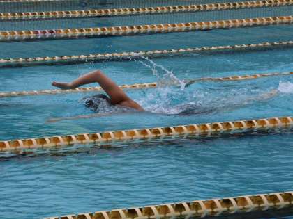 3年生Hさんの登場です。この種目は初めてのようですが、さすがの実力者です。バタフライでリードを奪うと背泳ぎでもリードをキープ。得意の平泳ぎで後続との差をどんどん引き離しクロールでさらに引き離して泳ぎ終えました。本人は、満足していないようですが、圧巻の泳ぎでした。