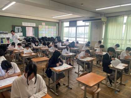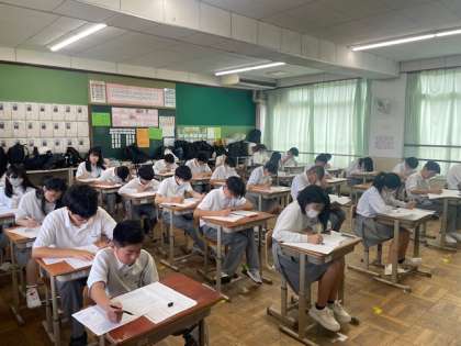 今日から3日間、1学期の学期末テストです。1年生にとっては初めての定期テストでしたが、章末テストの経験を活かし、落ち着いて臨むことができていました。2年生も、いつも元気いっぱいのみんなも、今日はとても集中してテストに臨めていました。廊下に掲示されている今年の目標には、「勉強頑張る!」「成績上げる!」「オール4とる」などなど、勉強を頑張ろうとする言葉がたくさん書かれていますね。その意欲を失うことなく、テストで十分力を発揮できるよう頑張ってください。