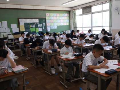 テスト2日目直前です。正門前であいさつをしていると普段より早めの登校をしている人もたくさんいます。そして、友達同士で問題を出し合っている姿も見かけます。1年生にとっては初めての定期テストです。テストで早く下校した後は、しっかり今日に向けての準備は出来たかな?2日目テスト直前1年生の様子です。