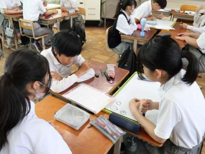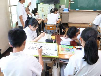 週末に夏季大会や学校外での活動で大変だった人もいるかも知れません。夏休みまで約2週間ですが、みんな授業も頑張ります。今日は、3時間目に2年4組数学の授業から見学です。いきなり8分のグループ学習からテンポ良くどんどん課題が出されてグループや仲間と解決していきます。ノンストップで50分が過ぎていきます。4時間目は2年2組の社会の授業。“なぜ、東京に一極集中するのか”をグループで考えています。大人が考えることと中学生が考えることは少し違うこともありいろんな視点があることが勉強になります。