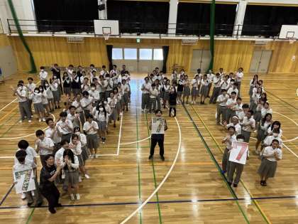 令和7年7月7日です。七夕でもあり、スリーセブンの日でもあります。3年生が、6時間目後に体育館に集まって写真撮影です。しっかり7の文字が見えているかな?