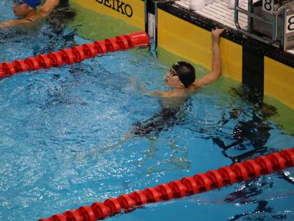 頂点をかけたレースが始まります。100メートル平泳ぎ決勝。予選のレース同様に前半から攻めている感じがします。得意の前を追う展開で後半に入っています。最後のきつい場面もペースは変わりません。電光掲示板にPBの表示が。自己記録更新です。この大きな大会の決勝の舞台で自己ベストで泳ぐことは立派です。