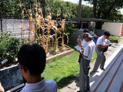 “ほうれん草は、暑さに負けてしまいました”“トウモロコシは、ちょうどいい時期に豪雨にあってしまってイマイチでした”とそれぞれが報告してくれています。体験・経験を通してたくさんの発見をしているようです。今日は、タブレットを使って現在の様子を記録しているようです。1組菜園では、ほうれん草、サツマイモ、トウモロコシ、なす、ピーマンを育てています。ここで育てた食材が、1組恒例の行事で使われるようです。楽しみですね。