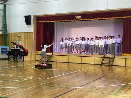 後半は各クラス実際に合唱を披露しました。歌う前に「大きい声出そな!」と友達に声をかけている人もいて、やる気が見えました。でも、緊張したと思います。お互いの合唱を聞きあうのも初めてでしたね。体育館で歌うと教室のように響かず、一人で歌っている気持ちになったかもしれません。まだお互いの声を聞きあってハーモニーを確かめる余裕はなかったかもしれません。伴奏者の人は、きっと誰よりも緊張したと思いますが、毎日クラスのために一生懸命練習をしてくれているのだなと感じました。指揮者の人は緊張しながらも、真ん中でみんなの合唱を聞いて、今後の練習をどうするか考えたことでしょう。口を縦に大きくあけてのどの奥を開くように声を出すこと、ブレスの位置をみんなで統一すること、全員笑顔で歌うこと、この3つ、合唱のコツです。やってみてください。担任の先生方は、ステージ下でみんなのことを一生懸命見守っておられましたよ。2年生の本気に期待しています!