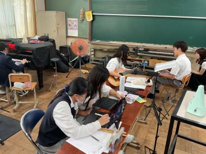 第2音楽室では、楽器を持込み作詞作曲をしているグループがありました。どんなテーマの歌なの?と聞くと、「青春」がテーマだと教えてくれ、楽しそうに考えていました。作りたい曲をイメージし、それを歌詞という言葉にするとき、どんな表現がいいのか、じっくり考えている人もいました。ピアノを弾きながらタブレットも使い、思いを曲という形にする。難しいけど、やりがいがありそうです。どんな曲ができるのか、楽しみですね!