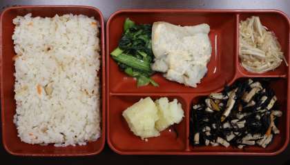 本日のメニュー。中華五目ご飯,これがおいしい!鱈のガーリックみそマヨネーズ焼き,なんと新メニュー登場。おろしにんにく、味噌、マヨネーズで作るタレを鱈にかけて、スチームコンベクションオーブンで焼き上げます。 これだけではありません。小松菜のいため物,ひじきと高野豆腐の煮物,のり塩じゃがバター,なめたけ煮と盛りだくさんのメニューに今日の給食も大満足でした。みなさんも給食いかがですか?