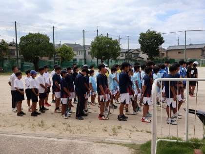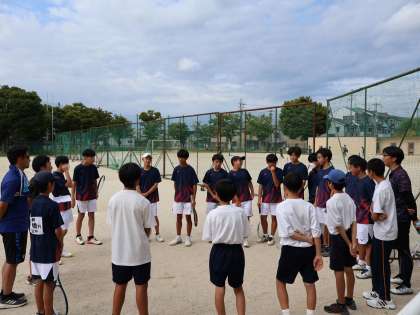 秋季大会男子テニス部団体戦が、ここ大淀中学校で開催されています。このブロック予選を突破して本戦出場権を獲得することが今日の目標です。京都産業大学附属中学校、太秦中学校、西ノ京中学校と総当たり戦で行われます。まもなく始まります。