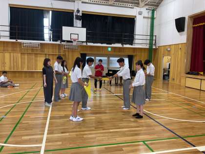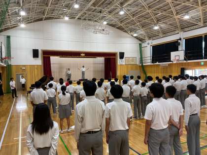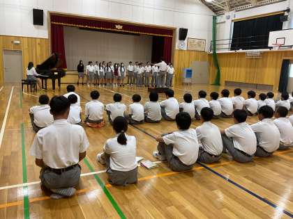 今日の合唱練習の時間、黄団は団合唱練習でした。初めは各学年の学級合唱を発表し合いました。どの学年も、リハーサルの時より声量が上がり、合唱としてひとまとまりの声が出せるようになってきました。3年生の合唱を、姿勢を正して聞いている2年生の姿もありました。団合唱練習では、団長と指揮者が前に立ち、みんなの気持ちを高める声掛けをしていました。一度、団全員で歌った後、団長から「みんな、もっと表情豊かに歌おう」という声掛けがありました。各学年ごとに歌って聞きあい、最後にもう一度団全員で歌う前に、さらに団長が「もっと声出して歌おう!」と繰り返し、みんなの気持ちを高めてくれました。そうして歌った最後の合唱は、一度目よりもさらに体育館に響くものでした。最後に、各学年からお互いを励まし合うメッセージの交換がありました。下級生からメッセージをもらった上級生の嬉しそうな表情がとてもよかったです。お互いを思いやる黄団の絆が見えました。合唱コンまであと二日です!頑張れ!