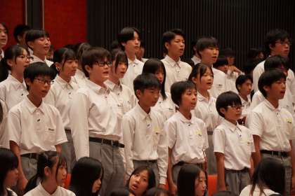 団合唱の黄団です。1年1・4組、2年1・3組、3年1・3組です。 Believeを歌います。